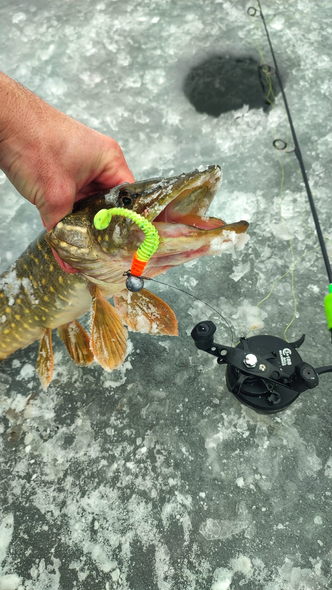 Всем привет. На выходных выбрался на не особо знакомый водоём. По крайней мере, этот участок ловли. Определившись с местом, быстренько расставил жерлицы. Их всего-то 5 штук. Ну а сам разбурил лунки для ловли на спиннинг. Буду краток... Спустя полчаса у меня произошла первая сработка. Размотки не было. Подождав три минуты, стал подсекать. Щучка умудрилась сойти прямо в лунке, выплюнув живца. Ещё бы какую-то секунду, и была бы на льду. Вторая сработка через 10 минут после первой! Ох и разматывала она... Клюнула щука на 2165 грамм. Заставила меня немного поволноваться. Всë заснял, немного позже опубликую. После этого срабатываний больше не было. До этого рекорд по щуке на жерлицы был 2 кг. На удочку удалось поймать только одну щучку. Но у меня, честно говоря, и поклёвка одна только была. Удалось разловить резину покрупнее. На этот раз 3 дюйма. Оснащал джиг-головкой 10 гр. Как по мне, так в отвес лучше использовать джиг-головку. Игра приманки будет намного интереснее. Пробур