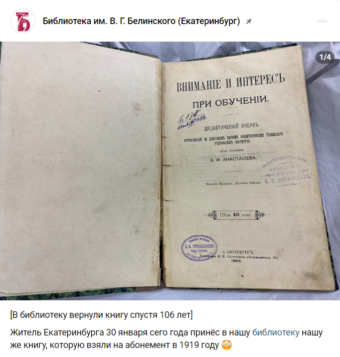 Житель Екатеринбурга вернул местной библиотеке имени В.Г. Белинского книгу, которую читатели взяли на абонемент еще в 1919 году. Об этом говорится на странице самой библиотеки во «ВКонтакте». «В книгу «Внимание и интерес при обучении» под редакцией А. И. Анастасьева был вложен лист с записью о том, что данная книга взята в июле 1919 года, а должна быть возвращена через месяц. К сожалению, лист не сохранился. Но сохранилась старая печать Белинки», — рассказали сотрудники библиотеки. Сообщается, что книга будет записана в Фонд библиотеки и передана в отдел редких книг. «Почему читатель не вернул ее через месяц — остается только догадываться. Просто для справки: 14 июля 1919 года в Екатеринбург вошла Красная Армия и окончательно установила свою власть. Так что додумывайте сами, что там могло произойти», — прокомментировали сотрудники библиотеки. Известны еще несколько подобных случаев, когда библиотекам возвращают книги, взятые более 100 лет назад. В октябре 2024 года стало известно, что