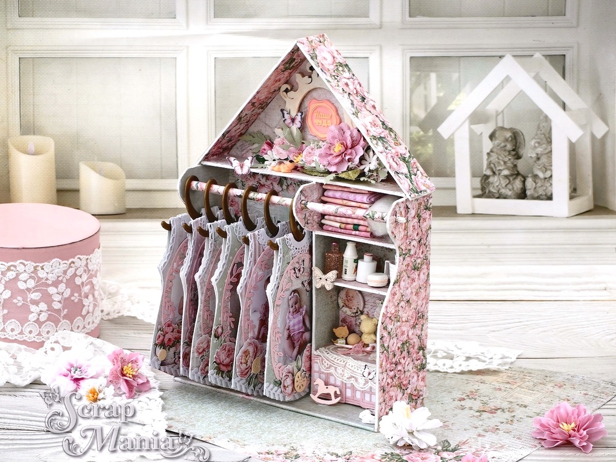 Добрый день! Снова с вами я, Рамзиля. И вот уже 9-ый сезон буду вас вдохновлять своими новыми работами и новыми идеями, чему, конечно же, я очень рада. Сегодня у меня для вас ми-ми-мишняя работа для новорожденной девочки из новой восхитительной винтажной цветочной коллекции "Шебби шарм" - шедоу бокс "Гардероб малышки". Коробка высотой 29.5см, длиной 21см и толщиной 7.5 см, каркас из плотного переплетного картона обклеен со всех сторон нлитами из наборов бумаги. Шедоу бокс состоит из двух частей - гардероб с "платьицами" и шкафчик с полочками для нужных вещей и игрушек. Крышу шедоу бокса оформила рамкой, бабочками и и нежными цветами и листьями из ткани, сделанными ножами "Шиповник крупный. Цветок" и "Веточки на ветру"). На полочках есть все, что необходимо для малышки - стопочка пеленочек, бутылочки, мерный стаканчик для приготовление молочных смесей, пустышка и разные игрушки. На полочке есть и "фотография" - фишка из набора "Кудряшка. Привет мир", а в самом низу закрытый шка