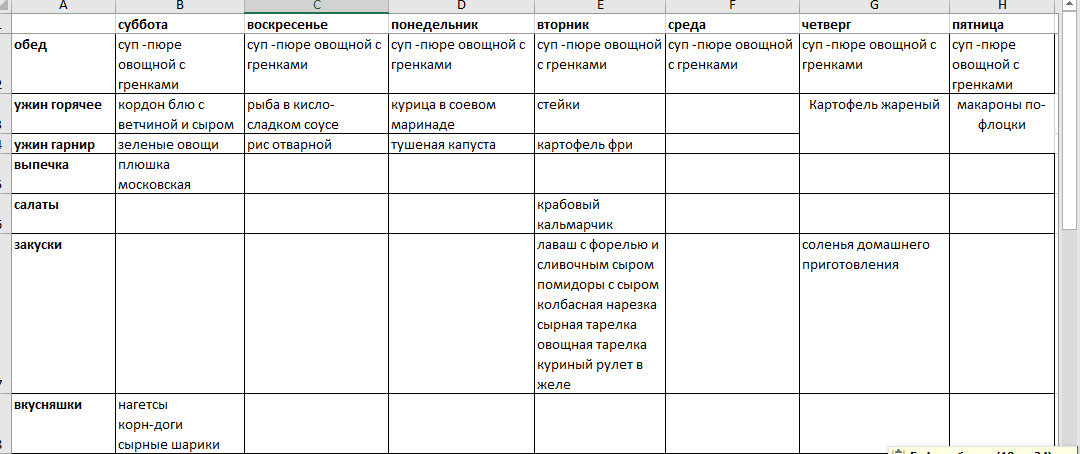 Вот и наступила новая неделя. Вчера спросила "хотелки" у своих. Ожидаемо, чо это блюда из фаст-фуда. Хорошо, что на прошлой неделе решила сделать заготовку нагетсов. На этой неделе только обжарить и все готово. Вот сегодня составила меню. Почему оно не стандартное? Потому что на следующей неделе во вторник у нас семейный праздник, поэтому меню составлено с учетом сытного праздничного ужина во вторник. Какие особенности моего меню на этой неделе? Ну, во-первых, я не готовлю каких-либо салатов и закусок на начало недели, так как салаты и закуски будут во вторник. Во-вторых, следующий день за праздничным вообще без блюд, так как с праздничного ужина останутся приготовленные блюда. И, в-третьих, конец недели более простой в блюдах, так как, опять же, останутся продукты с праздничного ужина. В нашей семье принято, что, если праздник выпадает на неделю, то отмечаем мы его день в день праздничным ужином, а в выходные отмечает с друзьями, родственниками. По желанию именинников. Итак, для сост