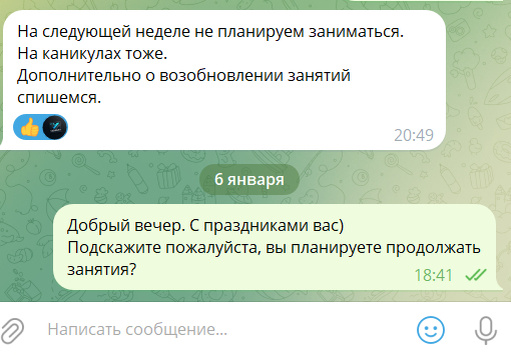 Ссылка на первую часть истории. В итоге мы позанимались всего 3–5 часов, не больше. Хотя я заранее предупреждал, что для хорошего результата нужно больше времени. Но мама ученика сказала: «Посмотрим, если понадобится — возьмём ещё». Когда же она всё-таки решила взять дополнительные занятия, у меня уже всё было расписано. Дело шло к Новому году, а значит — каникулам. За неделю до них мама ученика написала мне и отменила занятие. Хотя ещё можно было позаниматься хотя бы один раз, закрыть пробелы, подтянуть материал. А ведь каникулы — это золотое время для улучшения успеваемости! После праздников я ей написал. Она прочитала сообщение, но так и не ответила. Видимо, желание помочь ребёнку испарилось вместе с новогодними хлопотами. Я искренне не понимаю таких людей. Если не собираешься продолжать занятия — просто напиши об этом. В чём сложность? Почему так сложно дать ответ, вместо того чтобы просто игнорировать? Но я очень рад, что она не ответила. Нервы будут целее Выводы: