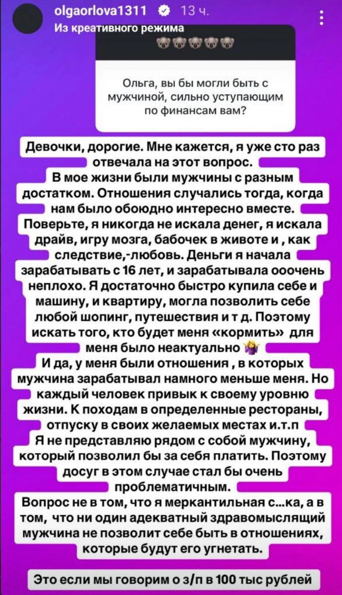 Ксения Бородина собирается замуж за 36-летнего блогера Николая Сердюкова. Не секрет, что он зарабатывает в разы меньше, чем его спутница. Аудитория уверена, что молодой человек имеет корыстные мотивы, но сама Бородина отказывается в это верить. Что касается Ольги Орловой, то она дала однозначный ответ о том, смогла бы встречаться с мужчиной, который зарабатывает меньше. Ольга призналась, что у нее был такой опыт в жизни. Однако мириться с тем, что мужчина позволяет ей платить за себя во время отдыха и путешествий, она не стала. «Вопрос не в том, что я меркантильная, а в том, что ни один адекватный здравомыслящий мужчина не позволит себе быть в отношениях, которые будут его угнетать. Это если мы говорим о з/п в 100 тысяч рублей», — высказалась телеведущая (орфография и пунктуация авторов здесь и далее даны без изменений. — Прим. ред.). Скриншот из блога Ольги Орловой. Фото: соцсети/ @olgaorlova1311 Отметим, что несколько лет Орлова состоит в браке с бизнесменом Валерием Масловым. Зарабо