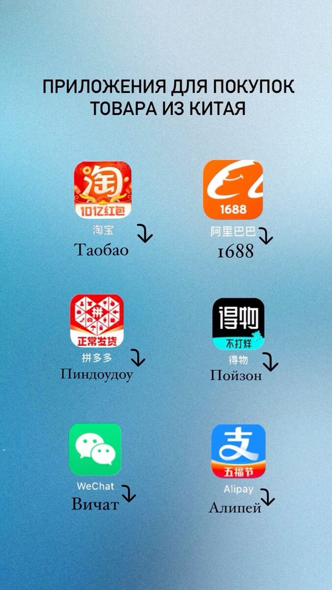 Наверняка те, кто особо не вникал в тему Китая, не имеют даже малейшего представления о площадках, которые я часто упоминаю в постах Сегодня расскажу немного о каждой 👇 Таоbao- пожалуй самая популярная китайская площадка. 🔻Цены чуть выше низких😁 🔻Доставка по Китаю обычно бесплатная. 🔻Есть магазины оригинальных брендов. 🔻Купить там можно практически всё. 1688- внутрикитайская площадка для крупного и мелкого опта. 🔻Доставка часто платная(1-5¥) 🔻Цены значительно ниже, чем на ТАОВАО 🔻Практически всегда можно заказать от 1шт POIZON- китайская торговая площадка с оригиналами брендов по ценам значительно ниже рыночных PInduoduo- китайская площадка для настоящих любителей шоппинга. 🔻Очень много скидок и купонов. 🔻С купонами цены значительно ниже таобао и 1688 🔻Купить можно практически все: от мелочей до крупногабаритных товаров WeChat - китайский WhatsApp , можно связаться напрямую с фабрикой/поставщиком(поставщики есть в обучении) 🔻очень много качественных люксовых копий ➡️С каж