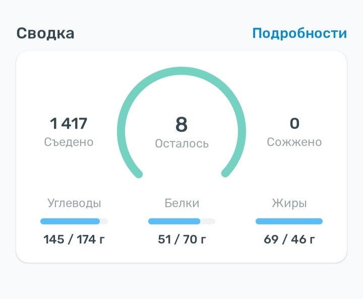Тихо сам с собою я веду беседу)) Ничего страшного, для себя ведь пишу. Сегодняшний день - в зачет. Питалась сносно, отработала хорошую кардио тренировку. На работе обычная запарка, и как всегда хотелось утянуть сладкое. Не сильно сопротивлялась, утащила и конфетку, и зефирку. Но не переела, нет. Мало белка, но это моя построянная беда, буду стараться это исправить. Уже не чувствую себя таким пузыриком, как вчера. Но весов буду бояться еще несколько дней. Ниже честное сегодняшнее фото и честный же расклад из приложения. .