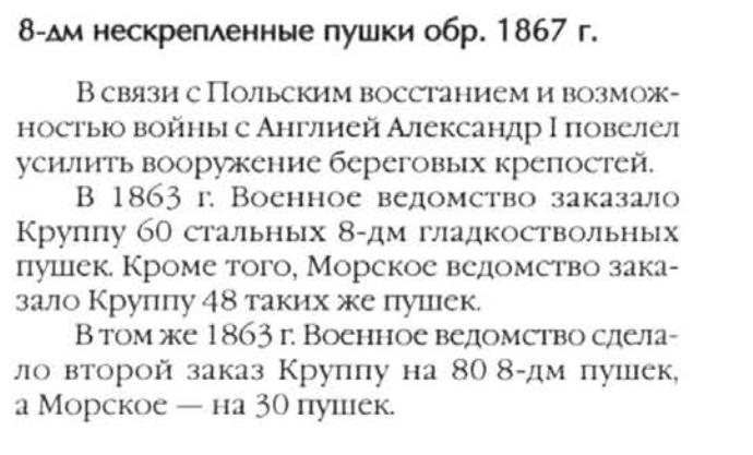 Это потом они стали 8-дюймовыми (когда стали нарезными). Второй заказ у Круппа был на 80 гладкоствольных пушек для Военного ведомства и 30 для морского.