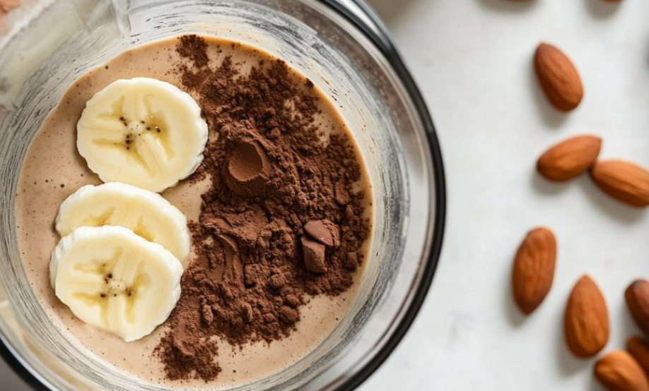Поместите в блендер миндальное молоко, замороженный банан, какао-порошок, арахисовую пасту, протеиновый порошок и лед.