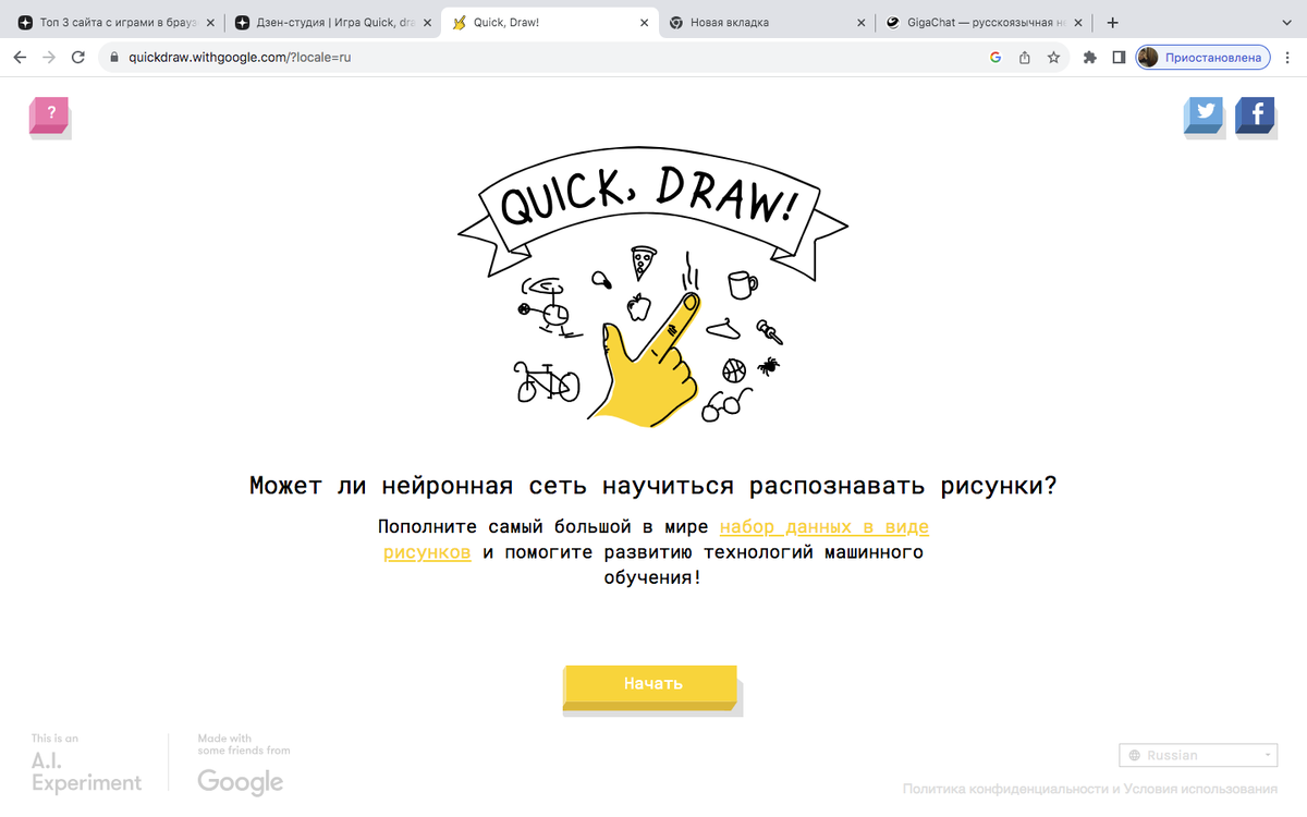 **Quick, Draw!** — это увлекательная игра от Google, которая была запущена в рамках проекта **Google AI Experiments**. Основная цель игры заключается в том, чтобы пользователь рисовал простые объекты за ограниченное количество времени, а нейронная сеть пыталась угадать, что именно он нарисовал. ### Как работает игра: 1. **Начало игры**: Когда вы заходите на сайт игры, вам предлагается выбрать одну из трех попыток для рисования. 2. **Рисование**: В каждой попытке у вас есть всего 20 секунд, чтобы нарисовать предложенный объект. Например, это может быть «кошка», «дерево» или «дом». Вам нужно быстро набросать рисунок, используя простой карандашный инструмент. 3. **Угадывание нейросети**: Пока вы рисуете, нейросеть пытается угадать, что изображено на вашем рисунке. Она делает предположения на основе того, что видит, и отображает их рядом с вашим рисунком. Если она правильно угадывает до истечения времени, то переходит к следующему раунду. 4. **Оценка результатов**: После завершения всех тр