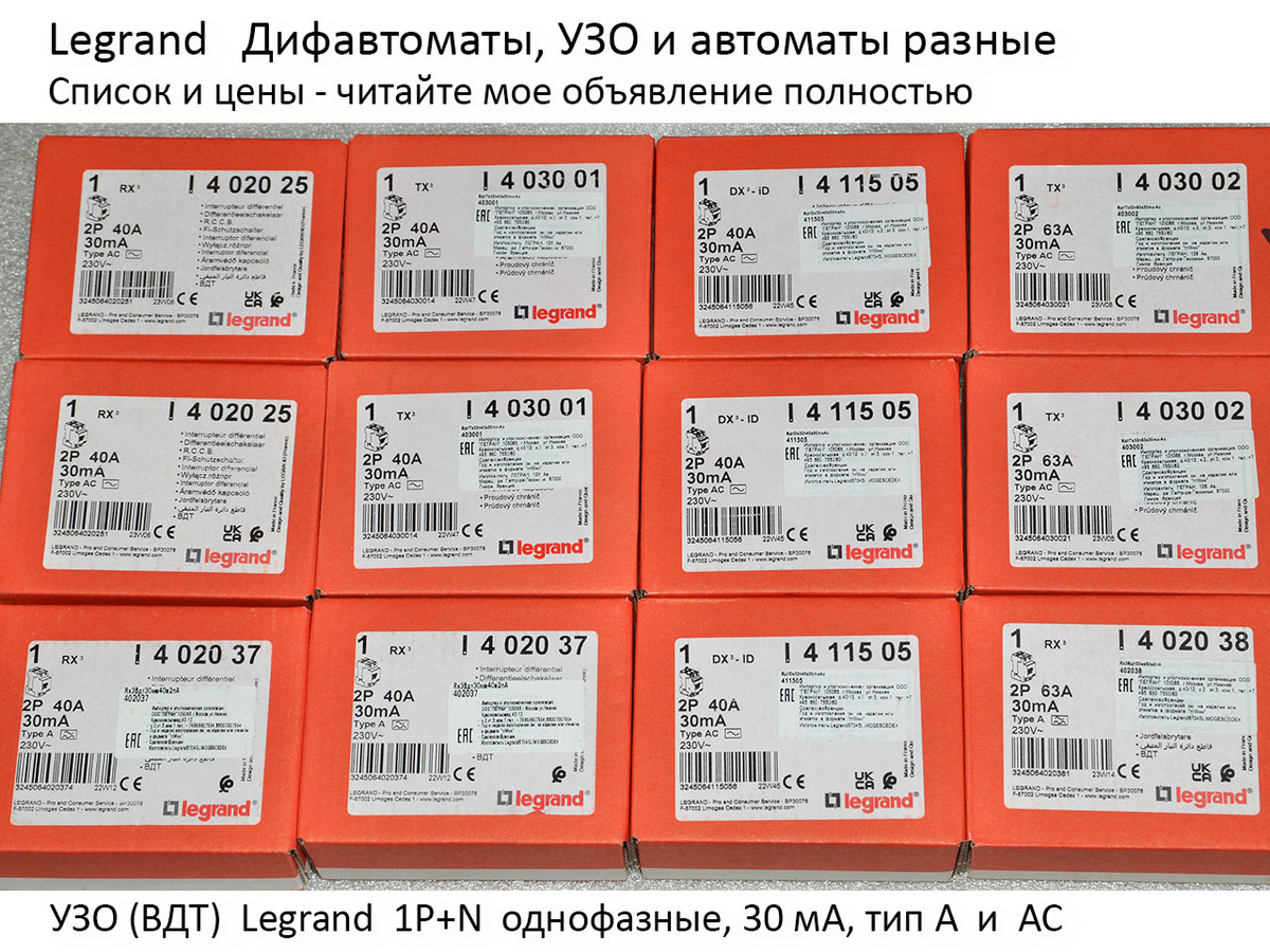 Цены указаны при условии оплаты наличными и самовывозе. С доставкой чуть дороже. Уточняйте наличие и цены на день покупки. - 2p RX3 25А 30мА тип A, 10kA, 402036 = 5000р, мало - 2p RX3 25А 100мА тип A, 10kA, 402028 = 5500р, 1 шт - 2p RX3 40А 30мА тип AС, 10kA, 402025 = 3000р - 2p RX3 40А 30мА тип A, 10kA, 402037 = 5200р - 2p TX3 40А 30мА тип AС, 10kA, 403001 = 3500р - 2p DX3-ID 40А 30мА тип AС, 10kA, 411505 = 4000р - 2p TX3 40А 300мА тип AС, 10kA, 403039 = 5000р - 2p RX3 63А 30мА тип AС, 10kA, 402026 = 3900р - 2p RX3 63А 30мА тип A, 10kA, 402038 = 6000р, мало - 2p TX3 63А 30мА тип AС, 10kA, 403002 = 4500р - 2p TX3 63А 300мА тип AС, 10kA, 403040 = 5800р **** **** - 4р RX3 25А, 30мА тип AC, 10кА, арт. 402062 = 4500р - 4р RX3 25А, 30мА тип A, 10кА, 402074 = 6000р, 1 шт - 4р TX3 25А, 30мА AC, 10кА, 403008 = 5000р, 1 шт - 4р LR 40А, 30мА AC, 10кА = 4000р, 1 шт - 4р RX3 40А, 30мА AC, 10кА, 402063 = 5000р - 4р TX3 40А, 30мА AC, 10кА, 403009 = 5500р - 4р DX 40А, 30мА AC, 10кА = 5000р много