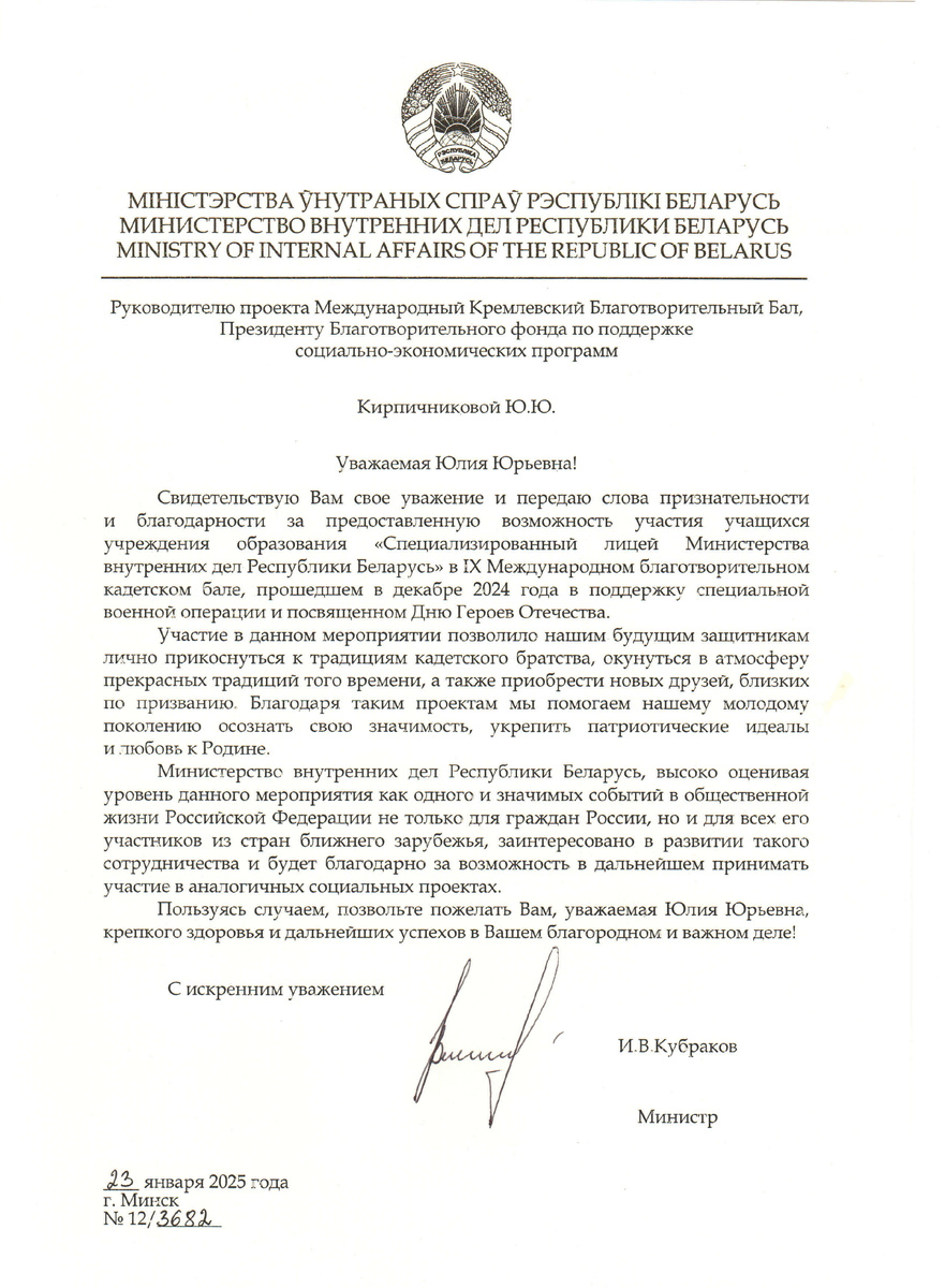 Официальный представитель МВД Республики Беларусь в Посольстве Республики Беларусь в Российской Федерации, полковник милиции Максим Русак вручил руководителю Патриотического Проекта «Международный Кремлёвский Благотворительный Кадетский Бал» Юлии Кирпичниковой письмо Министра внутренних дел Республики Беларусь Ивана Кубракова, в котором отмечено, что «Министерство внутренних дел Республики Беларусь, высоко оценивая уровень данного мероприятия (МБКБ) как одного из значимых событий в общественной жизни Российской Федерации не только для граждан России, но и для всех его участников из стран ближнего зарубежья, заинтересовано в развитии такого сотрудничества и будет благодарно за возможность в дальнейшем принимать участие в аналогичных социальных проектах». Пресс-центр МБКБ, Людмила Вадимовна Ванина Международный Благотворительный Кремлёвский Кадетский Бал.
