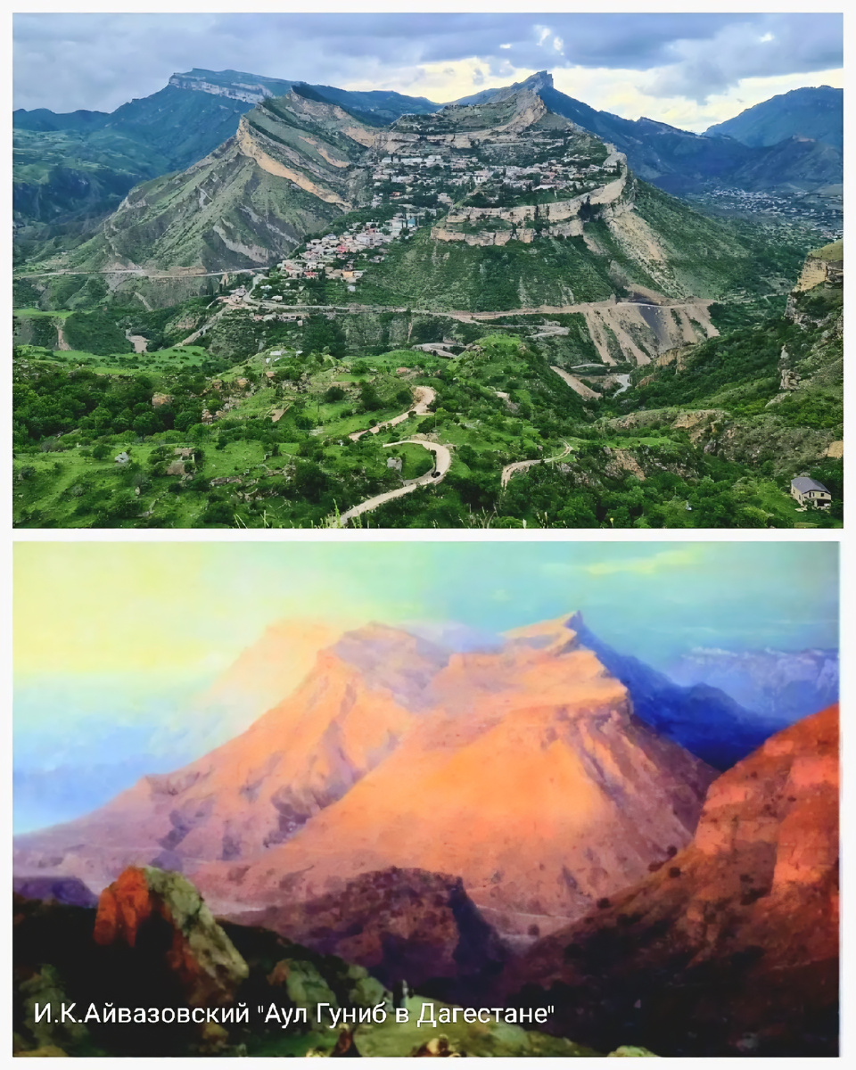 "Вот я снова стою На знакомой кремнистой вершине. Здравствуй, славный Гуниб, Дагестана живая краса! Подо мною аул, Где всегда на зелёной равнине, Словно солнечный свет, Мне цветы обжигают глаза. Я дышу высотой. Облака мне ложатся на плечи. Слышу вздохи Койсу — Ледяной своенравной реки. И, как верных друзей, Тополя обнимаю при встрече И приветствую горы Торжественным взмахом руки". /Расул Гамзатов/ 🎨В 1868 г. Айвазовский совершил путешествие на Кавказ. Эта поездка оставила неизгладимый след в творчестве художника. Его коллекция картин морских просторов пополнилась горными пейзажами. 🎨В своём путевом альбоме, который сейчас хранится в картинной галерее Феодосии, Айвазовский зафиксировал живописные места Кавказа. На основе этих набросков художник создал 20 работ. Он показал их на специально организованной персональной выставке в Тифлисе. Среди этих работ и экспонировался пейзаж "Аул Гуниб в Дагестане". 🎨Место, запечатленное Айвазовским, связано с именем мятежного имама Шамиля. Именно
