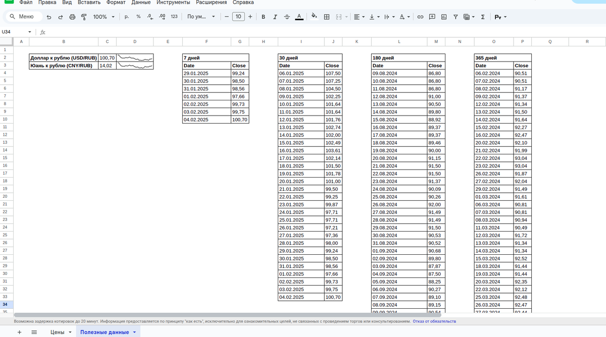 Google Finance автоматически обновляет курсы валют в течение дня, но не гарантирует точность данных – лучше сверяться с официальными источниками. Чтобы отслеживать изменения курса за определенный период, используем GOOGLEFINANCE с указанием диапазона дат. 📌 Эти формулы загружают исторические данные, которые можно использовать для анализа и построения графиков. При использовании GOOGLEFINANCE в Google Таблицах дата отображается с временем (23:58:00). Э