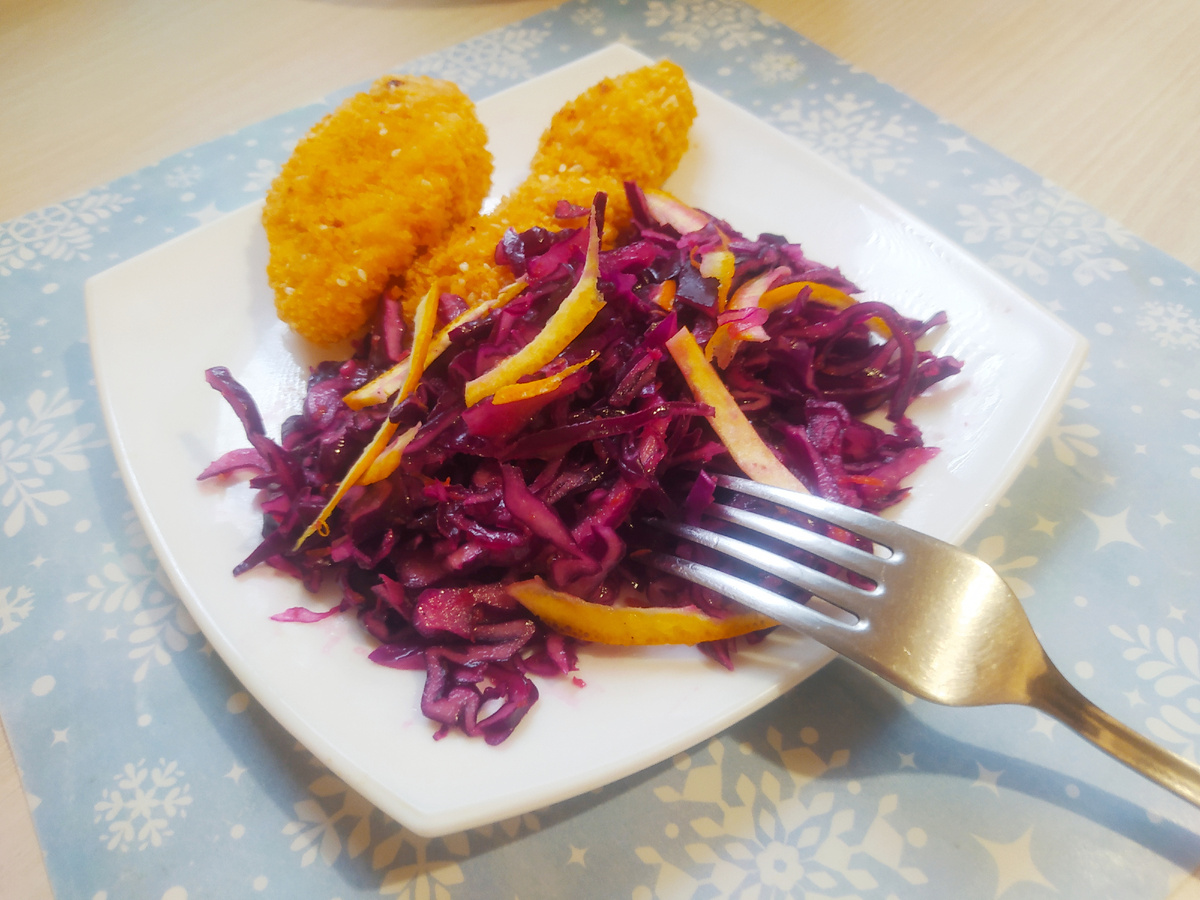 - В соусах для салатов из капусты содержится большое количество жиров. В этом случае часть масла заменена апельсиновым соком, поэтому и сладкий вкус.