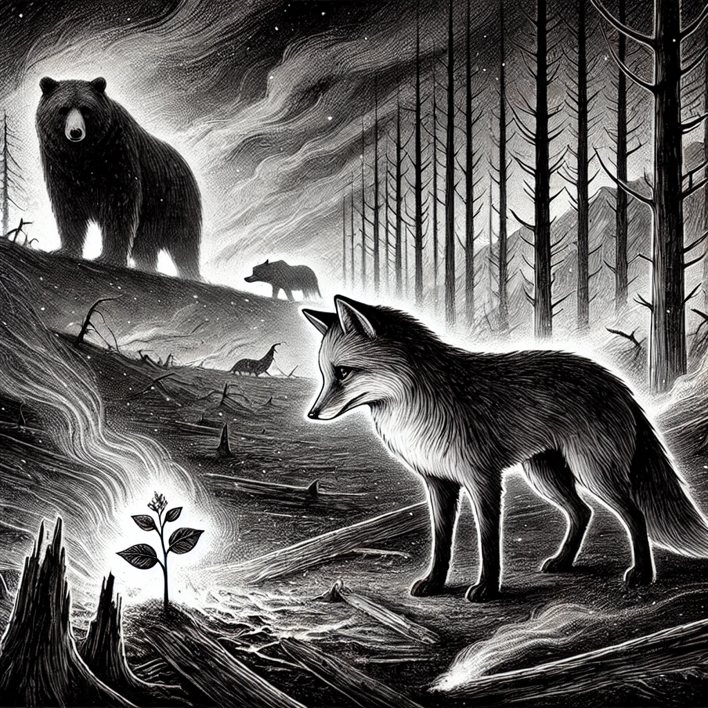Ночь была жаркой. Я стоял, вглядываясь в бушующее море огня. Лес пылал. Деревья, некогда тянувшиеся к небу, теперь падали одно за другим. Их голоса ломались в треске пламени. Красные языки ползли между ветвями, жадно пожирая всё, до чего могли дотянуться. Воздух был насыщен гарью, тяжёлый, давящий, заполняющий лёгкие. Я не мог дышать. Мир рушился у меня на глазах. Я хотел шагнуть вперёд, но не смог. Жар отбрасывал меня назад, словно сам лес не позволял мне приблизиться. — Нет... Я прошептал это слово, но оно утонуло в гуле пламени. Этого не должно было случиться. Лес был моим домом. Он был всем, что я знал. Я хотел броситься в огонь, спасти хоть что-то. Но мог только смотреть. — Почему? — Ты спрашиваешь у пустоты? Я вздрогнул. Голос раздался сбоку – низкий, спокойный, но наполненный силой. Я обернулся. На границе света и тени стоял Волк. Его силуэт дрожал в раскалённом воздухе, а глаза сверкали, отражая багряные всполохи. — Уходи, — выдохнул я. Волк склонил голову набок. — Зачем? — Это