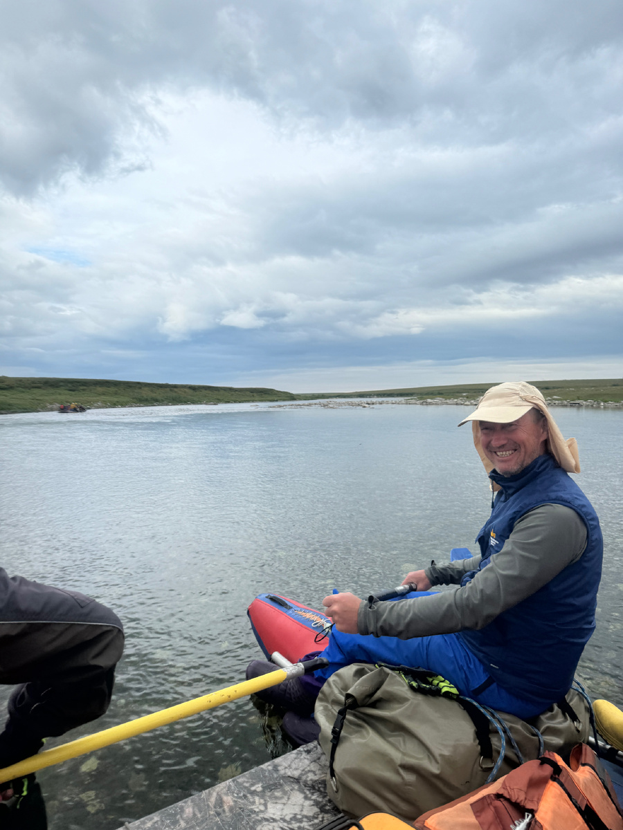 13 августа. Ния-Ю, Большая Уса, Уса сплав. Сегодня первое хмурое утро за весь поход. Привычно собрались, вышли рано. Прошли около 2-3 километров до впадения Ния Ю в Большую Усу. Горы уже далеко, каньон позади. Река здесь хорошо сплавная. Воды достаточно, почти не приходится протаскивать катамараны по перекатам. Справа и слева все небо затянуто тучами, ощущение что вот-вот разверзнутся хляби небесные. Но нам везет, дожди льют где то рядом, а над нами иногда даже проглядывает солнце. На Большой Усе, до впадения в нее Малой Усы опять проходим мимо стоянки оленеводов. Сначала издалека думали, что забор какой то стоит, но подойдя по ближе, видим, что это стадо оленей, и их рога создают впечатление какой то плетеной изгороди. Река здесь местами даже глубокая, на дне огромные белые валуны. Так как грести особо не нужно, решили разнообразить сплав рыбалкой прямо с катамарана. Кидаешь блесну там где глубоко, либо сразу после переката в струю, и тут же клюют огромные хариусы. Поймали неско