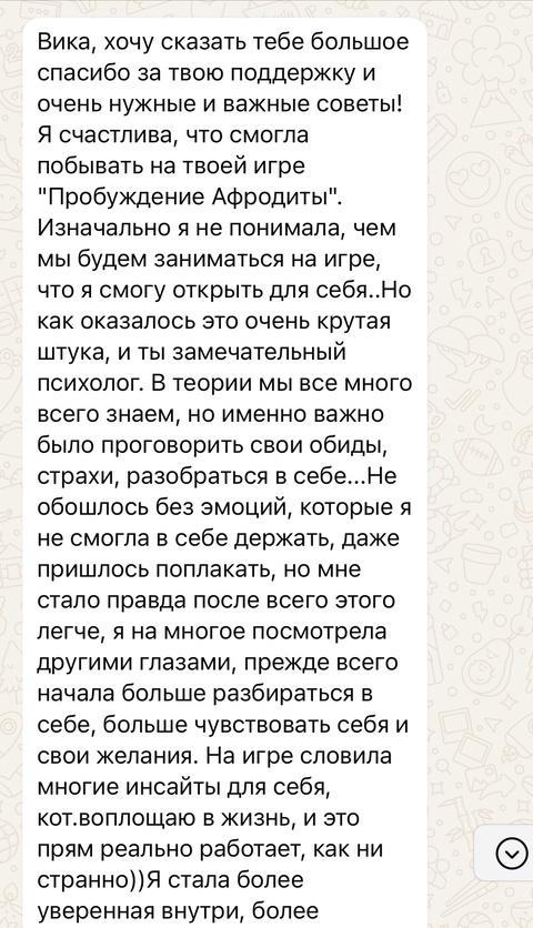 Как сохранить семью и себя в ней? История участницы трансформационной игры «Пробуждение Афродиты» Маша (имя изменено) пришла на игру вместе со своей подругой, совершенно не представляя, что её ждёт впереди. Она признаётся: «Изначально я не понимала, чем мы будем заниматься на игре, что я смогу открыть для себя..» Иногда люди участвуют в играх просто ради компании, но важно понимать, что игра всегда находит тот самый важный запрос, который нуждается в проработке. Для Машиной истории такой темой стали отношения с мужем. На момент участия в игре ситуация была критической: напряжение между супругами достигло предела, уже было подано заявления на развод, но Маша всё ещё сомневалась в правильности своего решения. «Не обошлось без эмоций, которые я не смогла в себе держать, даже пришлось поплакать» Но ведь именно через слёзы иногда происходит настоящее очищение. Игра шаг за шагом помогала Маше лучше понять свои чувства и желания. В безопасной атмосфере поддержки других участниц и ведущего-пси