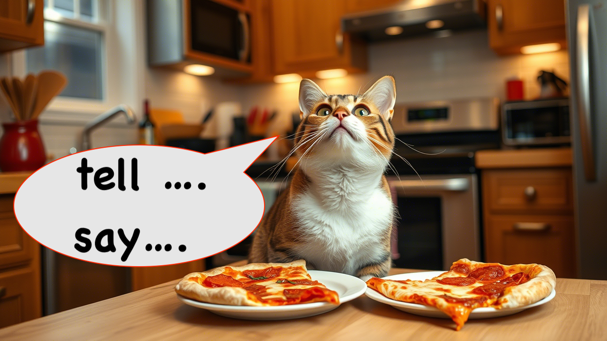 Привет, друзья! Меня зовут Слава, и я длительное время помогаю людям разбираться с английским. Но есть одна тема, которая сводит с ума даже самых упорных учеников: вечная путаница между say и tell. Почему? Потому что оба переводятся как «сказать»! Но сегодня я научу вас различать их так, чтобы даже ваш кот смог понять. А если не сможет… Ну, угостите его пиццей — и всё получится. Представьте: ваш кот Мурзик сидит на кухне и говорит что-то в пустоту. Это say— он просто издает звуки, не обращаясь ни к кому конкретно. А вот если Мурзик подходит к соседскому коту Барсику и сообщает, где спрятана колбаса, это уже tell — есть адресат! Главное отличие: Пример из жизни: