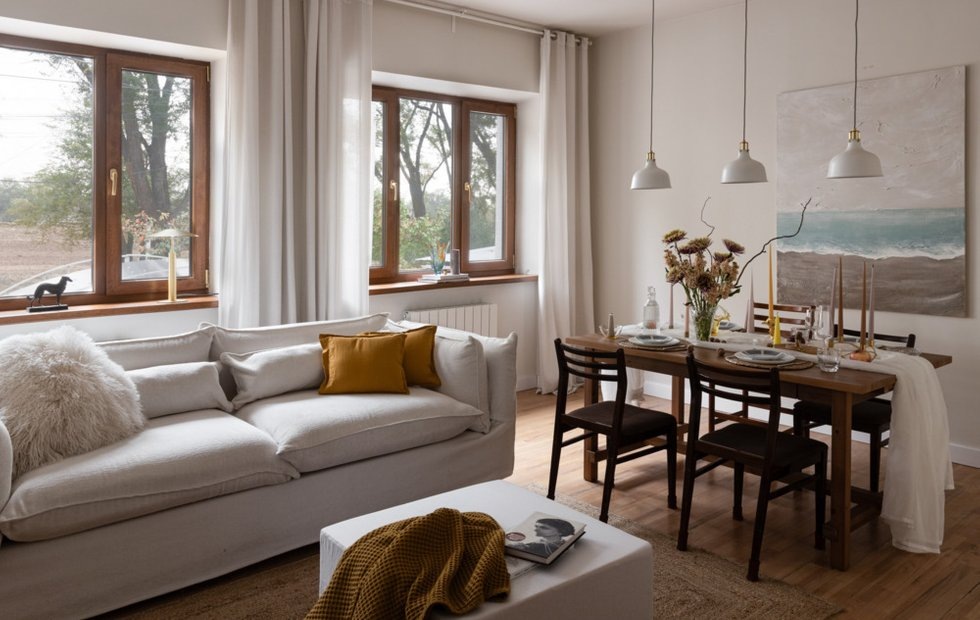 Планировка разработана в формате анфилады, объединяющей гостиную, кухню и веранду, с выходом в сад и окнами на обе стороны дома. Главной задачей было устранить проблему темных и неэффективных пространств: дневной свет почти не попадал в северные комнаты. Чтобы решить эту проблему, дизайнер спроектировала дополнительные окна и проемы. К примеру, были добавлены межкомнатные витражные двери, сделан проем, ведущий в столовую, а на крыше веранды появилось большое окно. Это наполнило интерьер естественным светом и визуально расширило пространство.