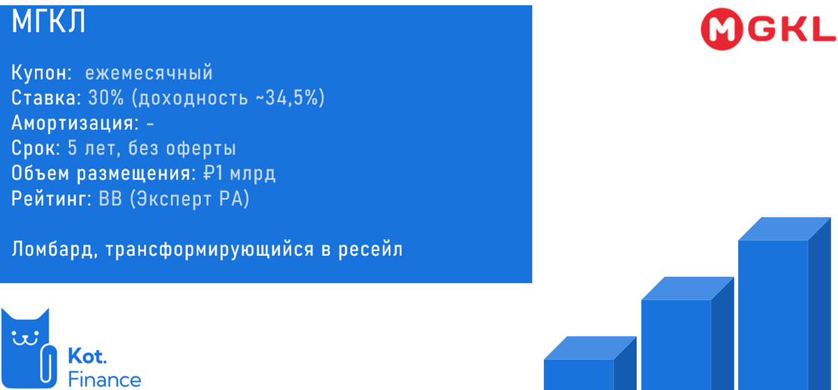 О выпуске Фикс-выпуск для квалифицированных инвесторов со ставкой 30% (доходность ~34,5%) на 5 лет без оферт. На снижении ставки – будет самый доходный вариант (доходнее ОФЗ), но много других рисков Наши обзоры: ⚡️ТГК-14 🚚Монополия 🚖Европлан ✈️ГТЛК 👉смотреть все обзоры О компании Ломбард, трансформирующийся в комиссионную сеть магазинов + моментальный выкуп золота, техники, меха. Слово «ломбард» больше не модно. Зато в презентации есть «экосистема» и комиссионка называется «ресейлом». Окэй 😉 Финансы Полугодовая МСФО отчетность. Аудитор из BIG4. Это важно? Рост выручки не трансформируется в рост прибыли Процентные доходы в стагнации, розничная торговля показывает рост, но это и расходы в аренде, зарплатах, риск товарных остатков Не смотря на понятную бизнес модель классического ломбарда (процентные доходы - процентные расходы - резервы на потери + доходы от продажи невыкупленного), рентабельность МГКЛ неоднозначная. То взлеты, то падения. Классический ломбард из отчетности – только