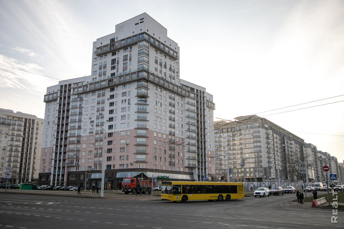 На противоположной стороне дороги также в 2005-м начали строить монолитный каркасный дом, состоящий из трех корпусов. Занимался им Минскстрой, но уже спустя пару лет эксплуатации жители столкнулись с серьезной проблемой - на некоторых этажах пошли трещины. По словам жильцов, проблема актуальна и сегодня. Далее рядом с ним в 2009 появилась еще одна многоэтажка в 19 этажей. Выполнена она была по индивидуальному проекту монолитных каркасных жилых домов.