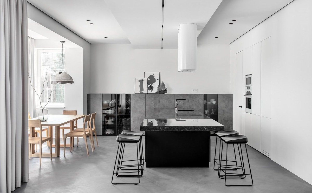 Дом площадью 235 м2 организован на двух этажах в монохромной палитре, которая объединяет обстановку, делая ее спокойной, простой и тихой.