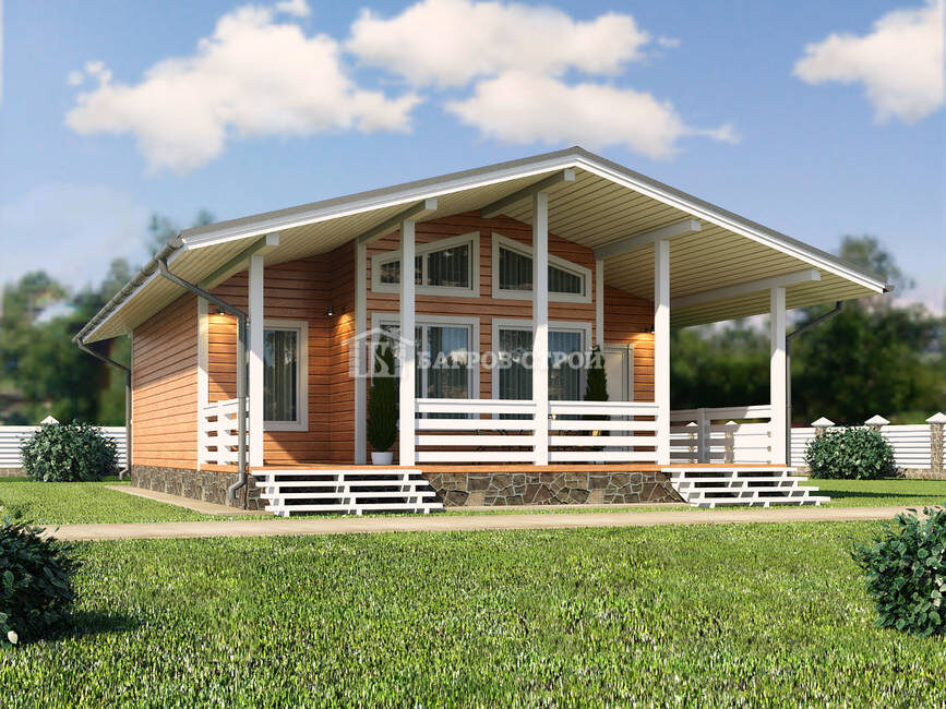 «Алфей» - каркасный одноэтажный дом 8х11,5м с большой террасой 21,53м². Общая площадь дома 92м². Планировкой предусмотрено 3 больших комнаты: 2 спальни, кухня-гостиная, а так же сан.узел и прихожая. • Площадь: 92 м²