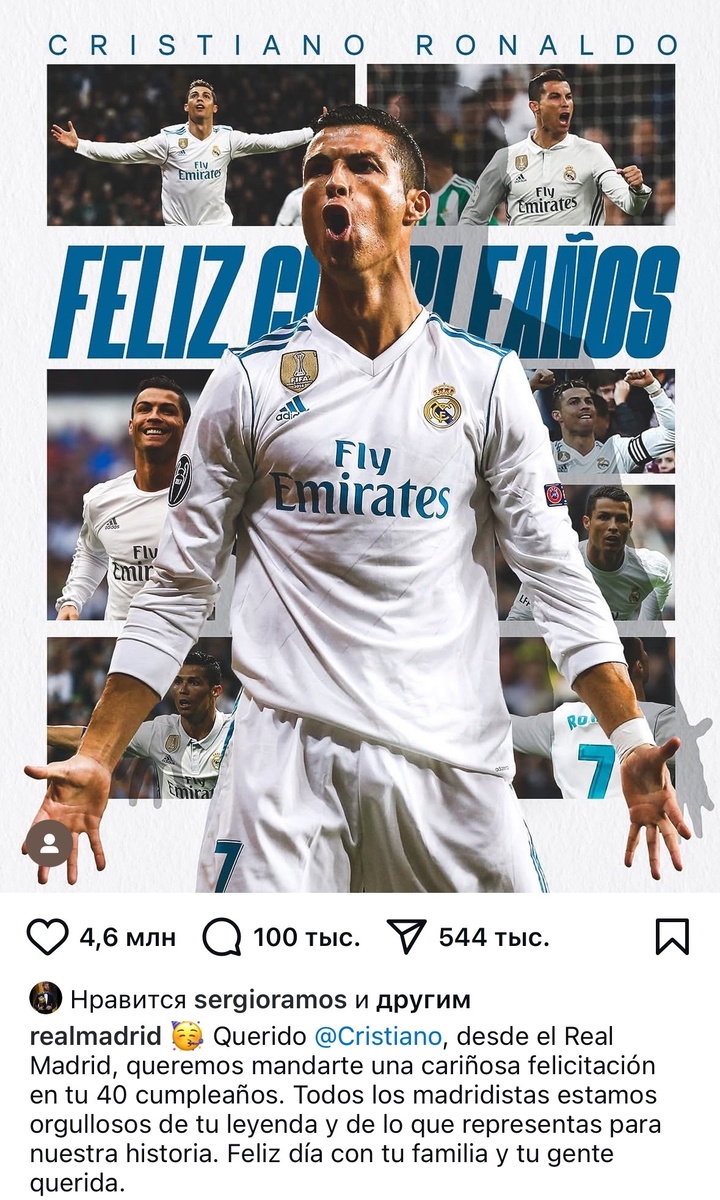 Великому Криштиану Роналду исполнилось 40 лет! За пару дней до дня рождения португалец назвал себя лучшим футболистов в истории – с этим вряд ли будут спорить поклонники «Мадрида». «Реал» первым из клубов, за которые выступал Криро, поздравил игрока с праздником: «Дорогой Криштиану, от лица мадридского «Реала» мы хотим поздравить тебя с твоим 40-летием. Каждый мадридиста горд тем, какой легендой ты являешься и то, как ты олицетворяешь нашу историю. Хорошего дня в кругу семьи и любимых». Роналду лайкнул пост «сливочных». В соцсетях болельщики заметили, что публикация «королевского клуба» появилась ровно в полночь. И еще один штрих: «Мадрид» поздравил Криштиану с днем рождения впервые после его перехода в «Ювентус» шесть лет назад. Криш – абсолютная легенда «Реала»: 438 матчей, 451 гол, 131 ассист и 15 трофеев. 40 лет, представляете? «Мать, спутница, подруга, жена»: Роналду поздравил Джорджину с днем рождения 💖 Лучшие бомбардиры в ЛЧ за один клуб. Здесь исключительно легенды Роналду – 4