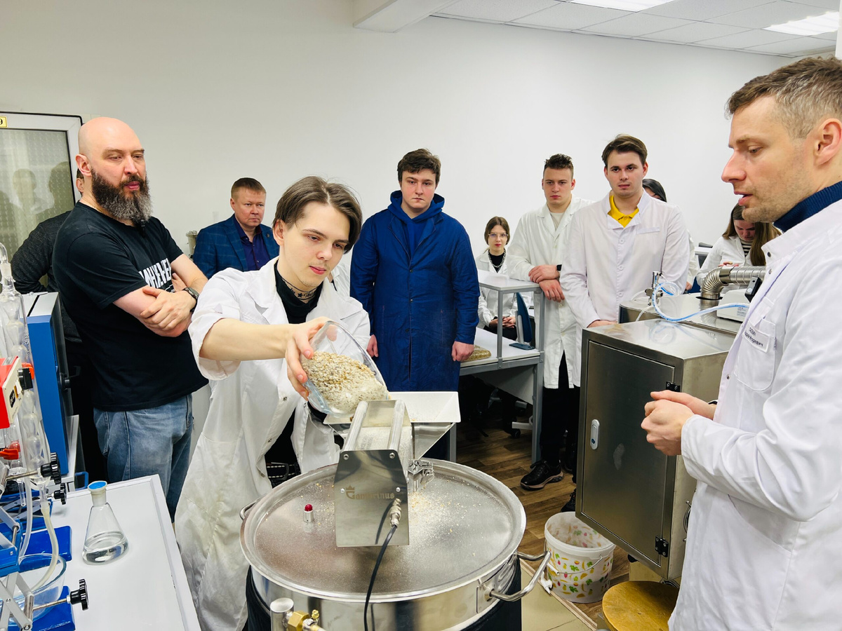 Как овладеть премудростями виноделия и технологиями бродильных производств? Студенты кафедры получили возможность развивать практические навыки пивоварения благодаря модернизированной лаборатории. Лаборатория технологии бродильных производств и виноделия была создана для практического обучения студентов кафедры технологии виноделия, бродильных производств и химии им. Г.Г. Агабальянца. Технологии изменяются, процесс дооснащения лаборатории постоянен. Благодаря средствам предприятий-партнеров в ней появились распылительная сушилка, оборудование для дистилляции и получения спирта (ректификации), микро- и мини-пивоварни. «Мы хотим, чтобы будущие специалисты учились работать на современном оборудовании, знали его устройство, возможности и могли применять в профессии в масштабах производства», – рассказал эксперт, ведущий канала «Русская Дымка» Владислав Кислицын. Заместитель гендиректора АО «Вятич» Андрей Галкин показал мастер-класс по варке пива, рассказал его рецепт с необычными ингредиен