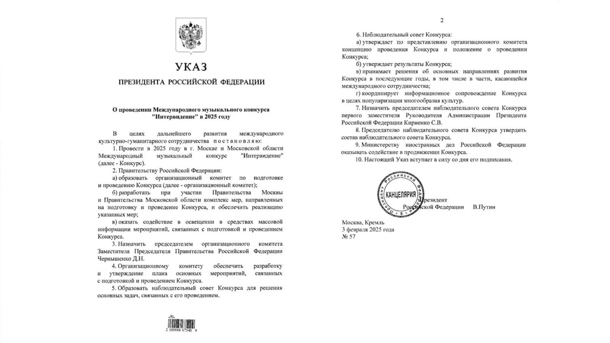 Президент РФ Владимир Путин подписал указ о проведении в Москве и Московской области международного музыкального конкурса «Интервидение» в 2025 году. Соответствующий документ появился на сайте официального опубликования правовых актов. В документе говорится, что мероприятие будет проведено «в целях дальнейшего развития международного культурно-гуманитарного сотрудничества». Председателем оргкомитета «Интервидения» назначен вице-премьер Дмитрий Чернышенко. Первый заместитель руководителя администрации президента РФ Сергей Кириенко назначен председателем наблюдательного совета конкурса. Конкурс песни «Интервидение» — конкурс эстрадной песни, проходивший в 1965—1980-х годах. Изначально в мероприятии участвовали исполнители из государств социалистического лагеря, позже география расширилась до других стран Европы, Центральной Азии, Африки и Америки. Создать «Интервидение» в 2023 году предложила министр культуры Ольга Любимова. Ранее Путин подписал закон о кратном увеличении штрафов за прод