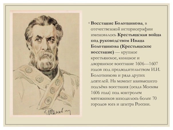 Крестьянская война 1606-1607 годов под руководством Ивана Болотникова. Своевременная война, как раз во времена Смутного времени. Интересен сам факт появления И.Болотникова в это время в России. Был холопом князя Телятевского. Бежал к казакам (к донским, запорожским? неизвестно), попал в плен к татарам и был продан в рабство османам, попал гребцом на галеры. Освободившись из неволи (немцы захватили турецкий корабль), оказался в Венеции и отправился на родину (интересно, кто его снабдил деньгами, путь- то не близкий). На территории Речи Посполитой встретился с одним из самозванцев. Повезло человеку, всё в строку. Попал (или послали) в Путивль, и надо же такому случиться, его принял местный воевода князь Шаховский (какие были доверчивые князья на Руси, увидел и поверил) и оказал помощь в организации похода на Москву с целью свержения Шуйского и восстановления "царевича" Дмитрия (Лжедмитрия) в правах на трон (воевода, КНЯЗЬ, незнакомому человеку денег дал, войско дал, не странно ли?). Воевал неплохо против правительственных войск, раскачивал страну различными обещаниями народу, призывая народ перейти на сторону защитников Лжедмитрия. Но проиграл и был утоплен. Как-то всё странно, Россия на тот момент воевала со ставленниками Речи Посполитой и он как-то своевременно появился из этой страны.