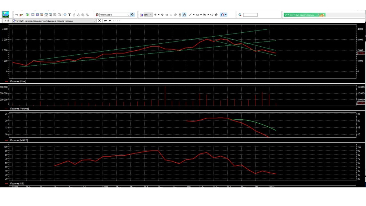 2. Новостной фон медленно ухудшается, компания iПозитив практически не появляться в канале новостей. Если и есть информация в новостной ленте, то ведется общий разговор о развитии компании на 2025 год, увольнение сотрудников практически закончилось, скорее всего к апрелю завершится. О дивидендах компания еще не решила вопрос, все вопросы будут решаться на акционерном собрании. Экономический отчет выйдет весной, показатели будут средние, это инвесторов не сильно обрадовало. К середине февраля доходит до уровня 1600, к концу февраля опускается на линию поддержки понижающегося коридора. К середине марта на линии поддержки коридора акции удается удержаться, даже сделать попытку развернуться наверх.