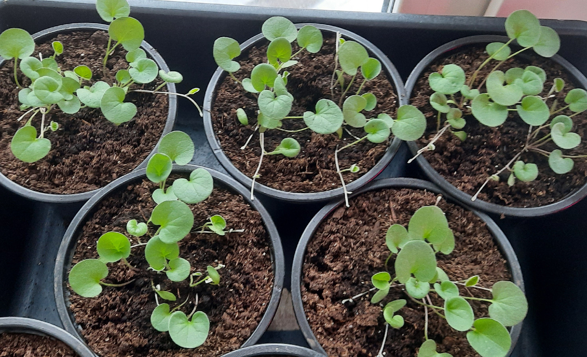 В это воскресенье перевалила рассаду дихондры из 100 мл стаканчиков в 500 мл.Тесновато ей было уже в маленьких стаканчиках.После перевалки она начала "разбрасывать"по сторонам свои крошечные отростки.