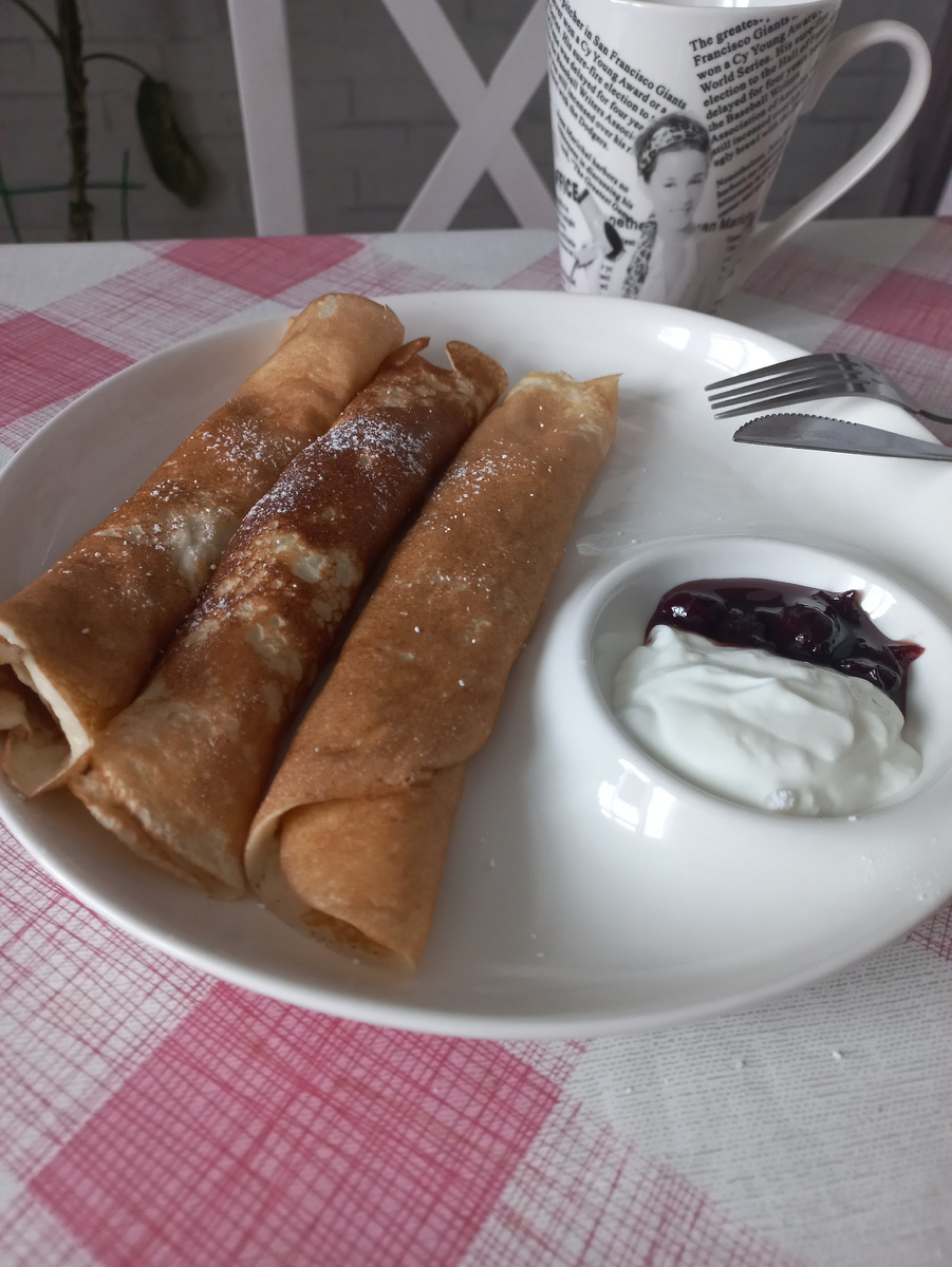 Всем всем привет ) на календаре 1 марта , суббота . Наступила весна и первая весенняя суббота . Да еще и на масляной и блинной неделе . Конечно нужно было напечь блинов . При этом в голове сразу возникает картинка с красивой и высокой горкой блинов . Но я столько никогда не пеку . Чаще всего делаю столько что бы хватило поесть на один раз . Во первых потому что самые вкусные блины горячие , только что со сковородки , ну а во вторых лень долго стоять у горячей плиты и вертеть сковородкой . Мне проще еще раз сделать тесто и напечь блинов повторно , допустим вечером . Еще есть вариант сделать теста побольше и держать его наготове в холодильнике , а печь по необходимости . Рецепт у меня всегда один самый надежный . Делать из того что есть в холодильнике на данный момент . В ход может пойти все , молоко , кефир , сливки , сметана в разных пропорциях и сочетаниях , получается всегда вкусно . В Монетке купила вчера к блинам сметану в стеклянной банке . 20 %, густая и вкусная , оф