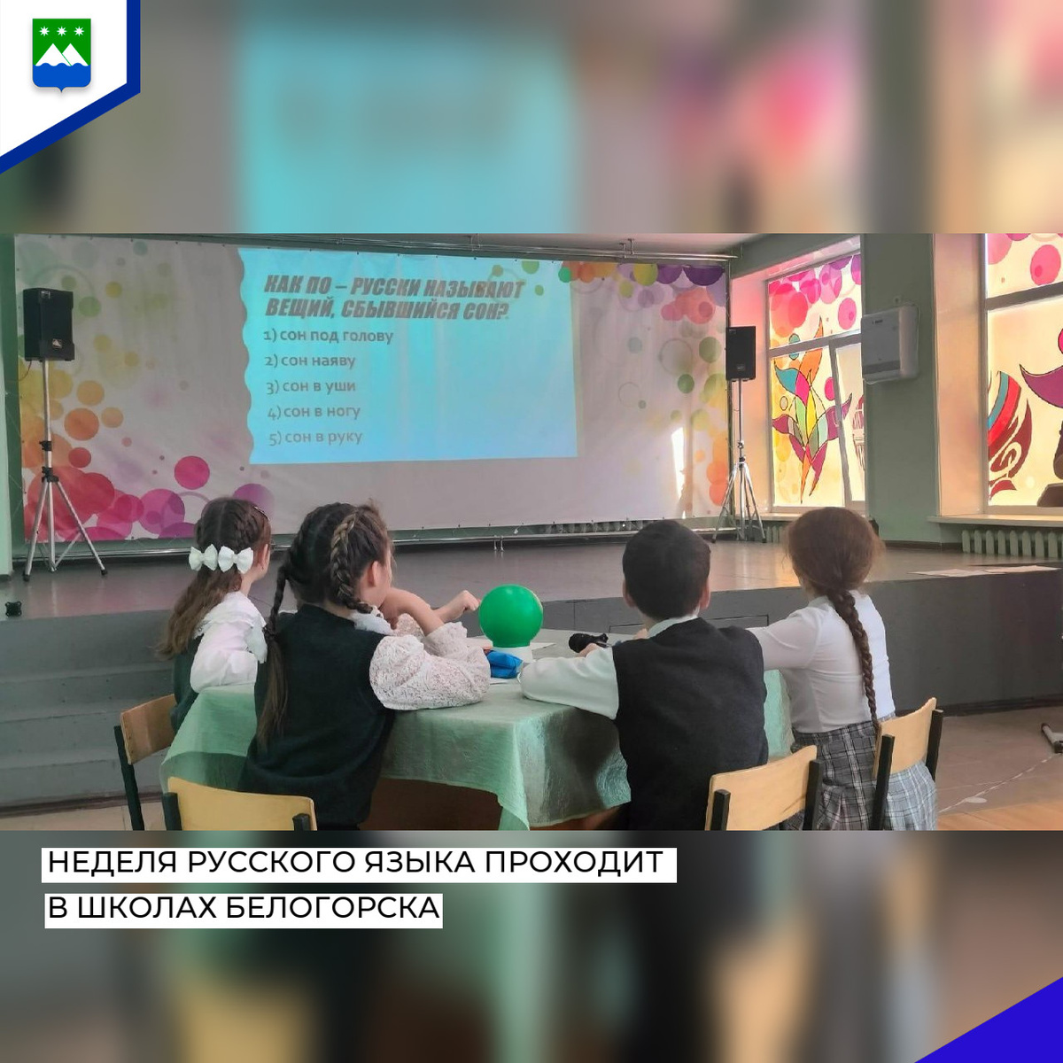В начальных классах школ Белогорска проходит предметная неделя по русскому языку «Грамматическая мозаика». Открыли ее торжественными линейками. — Неделя русского языка направлена на сохранение подлинной языковой культуры и повышению интереса к родному языку и литературе, — рассказала начальник организационно-методического отдела Комитета по образованию Ольга Рубченко. — К этому событию на базе школы №200 среди школ прошел городской брейн-ринг «Знатоки русского языка», в котором участвовали обучающиеся 4-х классов. В результаты игры победила команда школы №200, 2 место заняла школа №17. Проведение такой игры нацелено на развитие интеллектуальных способностей школьников, поддержание устойчивого интереса к русскому языку. Также в школе №200 состоялся «Тотальный диктант» для обучающихся 2-х, 3-х, 4-х классов, участие в котором приняли 48 человек. В школе №5 тематической неделе посвятили внеклассное мероприятие «Люби, знай и цени русский язык» для обучающихся 3-х классов, на котором познако