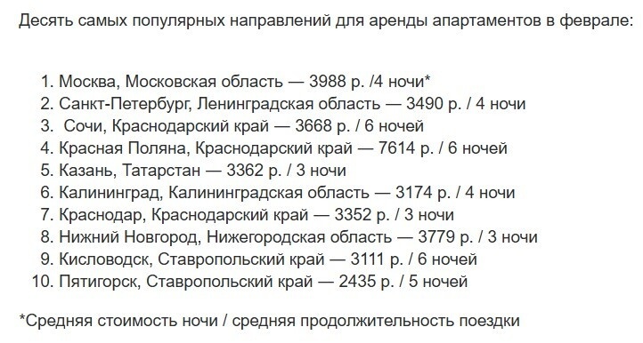 В феврале 2025 г. Нижний Новгород занял восьмое место в списке из десяти российских направлений, популярных для бронирования апартаментов. Об этом говорится в исследовании, подготовленном Tvil.ru. Стоимость ночи проживания в нижегородских апартаментах составляет в текущем месяце 3779 руб., арендуют объект на три ночи. На первом месте рейтинга расположилась Москва, собравшая 13% бронирований в апартаментах в феврале (3988 руб., четыре ночи), на втором — Санкт-Петербург (3490 руб., четыре ночи), а на третьем — Сочи (3668 руб., шесть ночей) На последние два города пришлось 11% и 5% бронирований (соответственно). NN.DK.RU писал также, что в январе 2025 г. село Дивеево Нижегородской области заняло третье место в списке самых популярных российских направлений однодневных бронирований.