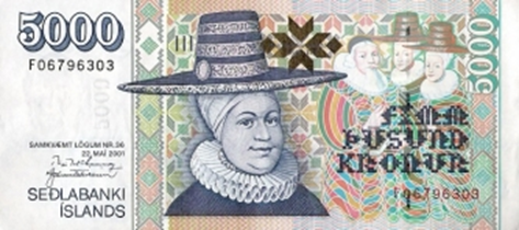5000 крон. Салли Йонсдоттир. (1646-1715). Модельер. Инфляция никого не щадит. Даже Исландские деньги. Это от чумы можно спастись на каком-нибудь острове, а от инфляции – нет! Так и тут. Долгие годы обходились жители острова двухтысячной купюрой, но вот пришла пора увеличивать номиналы. Для того чтоб увековечить этот момент они избрали Салли Йонсдоттир. Жизнь этой дамы окружена тайной. То ли от личной скромности, то ли от того, что жила она в те времена, когда не было в достатке скандальных газет, нахальных журналистов и Интернета, но события её жизни ускользнули от общественности. Госпожа Йонсдоттир, судя по изображению на купюре, занималась как бы мы сегодня сказали, моделированием одежды, однако поводом для её попадания в писанную Историю послужило необычная, прямо скажем, ситуация с её замужествами. Она оказалась женой двух Исландских епископов. Не в одно время, разумеется, не параллельно, а последовательно. Этакий переходящий от одного достойного человека к другому приз. Хорошая же