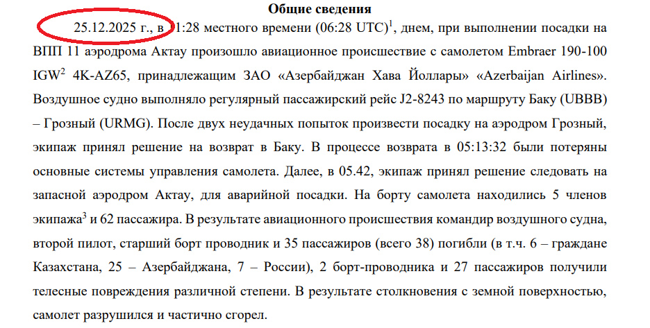Министерство транспорта Казахстана опубликовало предварительные результаты причин крушения азербайджанского пассажирского лайнера Embraer под Актау. Есть вопросы. Докладываю.