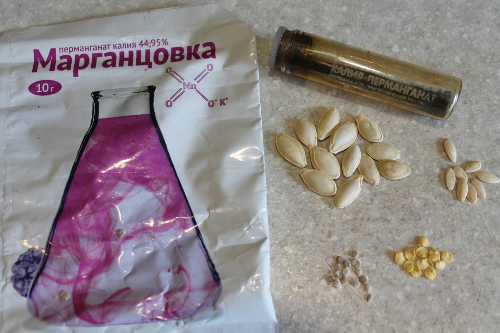 Самое известное проверенное средство для дезинфекции — марганцовка («Марганцовка, перманганат калия 44.5%»). Для 1% раствора разводят 1г порошка водичкой (100 миллилитров). Жидкость должна иметь темно-вишневый цвет. Выдерживают семя 20 минут.