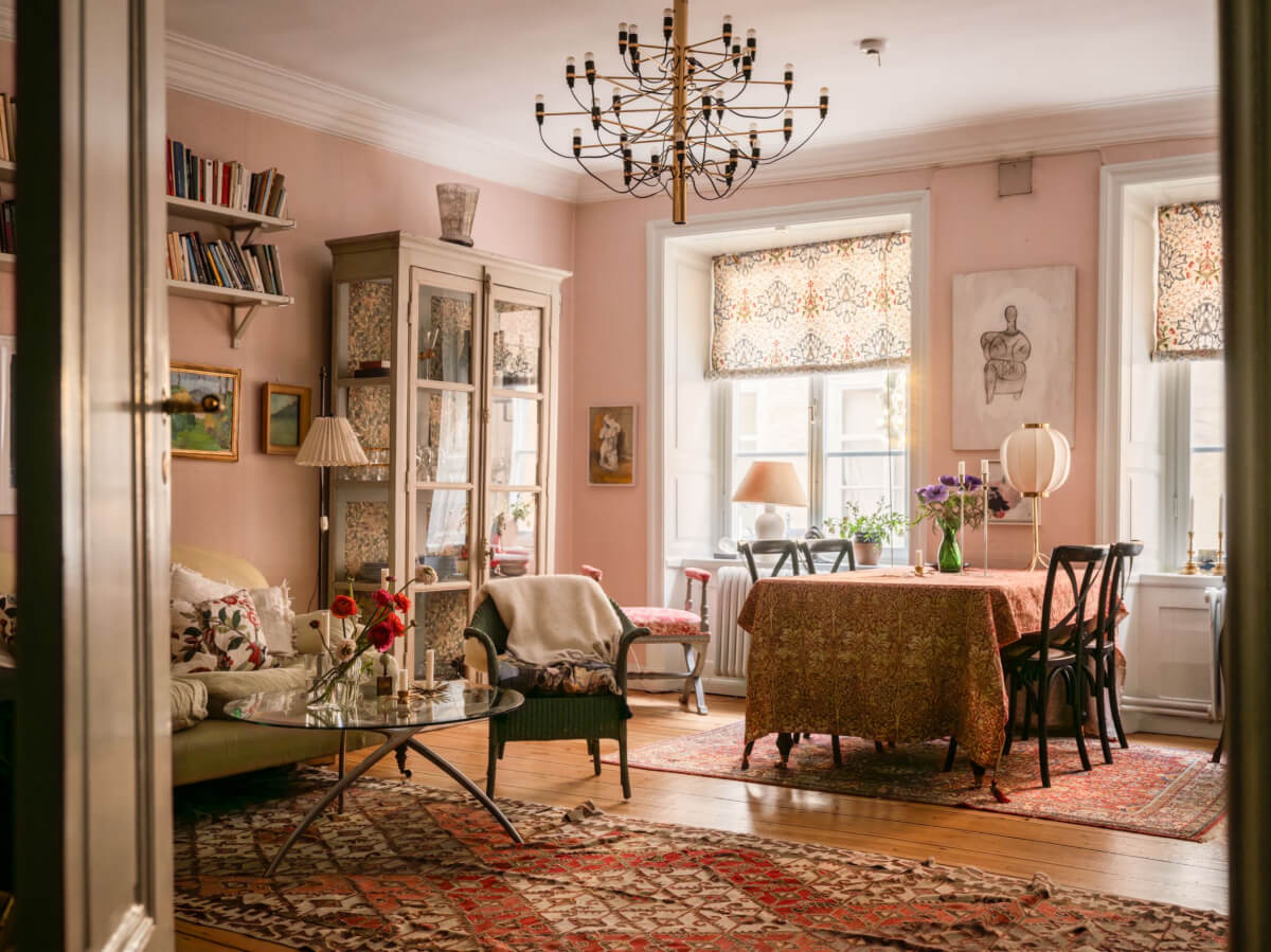 Сегодня мы идем в гости в уникальную квартиру в самом сердце старого Стокгольма. Дом, в котором она расположена, построен еще в XVII веке,но вопреки стереотипам о мрачных старинных зданиях, внутри — уютное, светлое пространство, где каждое окно, пол и дверная ручка помнят прошлые века. Как же удалось сохранить дух старого дома, но сделать его удобным для жизни? Давайте посмотрим. Начнем с гостиной. Светло-розовые стены, деревянные полы с вековой историей и настоящая дровяная печь. Представляете, какие вечера можно проводить здесь, когда за окном стокгольмская зима, а внутри потрескивают дрова? Что делает это пространство таким уютным? Во-первых, книги. Их тут много, и они создают ощущение, будто хозяева живут здесь не один десяток лет (хотя на самом деле ремонт делали недавно). Во-вторых, текстиль — его здесь море. Разные узоры, ткани, фактуры, но каким-то чудом все гармонирует между собой. Ну а если добавить мягкий свет и старинные ковры, получится идеальное место для долгих зимних ве