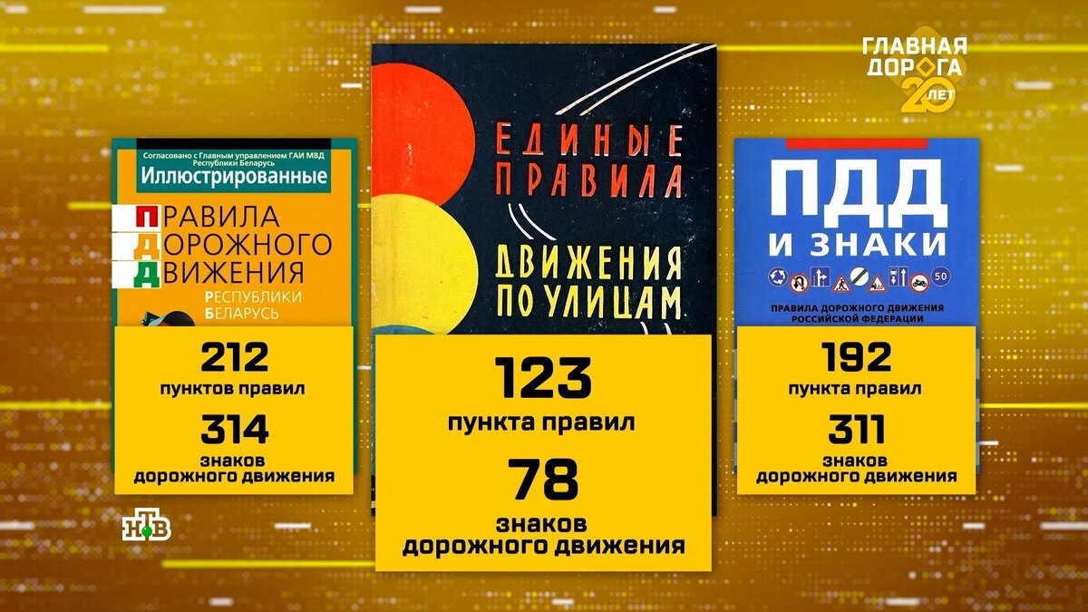 [ Смотреть видео на сайте НТВ ] Чем больше правил дорожного движения, тем меньше их соблюдают. Обилие знаков называется информационным шумом, водители просто перестают обращать на них внимание. В 30-х годах СССР был одним из разработчиков системы международных правил, а потом и международной конвенции о дорожном движении. В современной Белоруссии насчитывается 212 пунктов правил и 314 знаков дорожного движения, в России сейчас 311 дорожных знаков и 192 пункта правил. В СССР было 78 знаков и 123 пункта, но тогда лишенному прав за пьянку водителю могли их вернуть раньше срока. Юрий Безруков, главный хранитель фондов музейной экспозиции ЦСН БДД МВД РФ: «Были такие случаи, когда трудовые коллективы по ходатайству могли освободить этого водителя от административной ответственности, то есть взять на поруки». Большинство стран подписали Женевскую или Венскую конвенции о дорожном движении, а то и обе. То есть основа у всех правил везде одинаковая. Бытует мнение, что в азиатских странах на доро