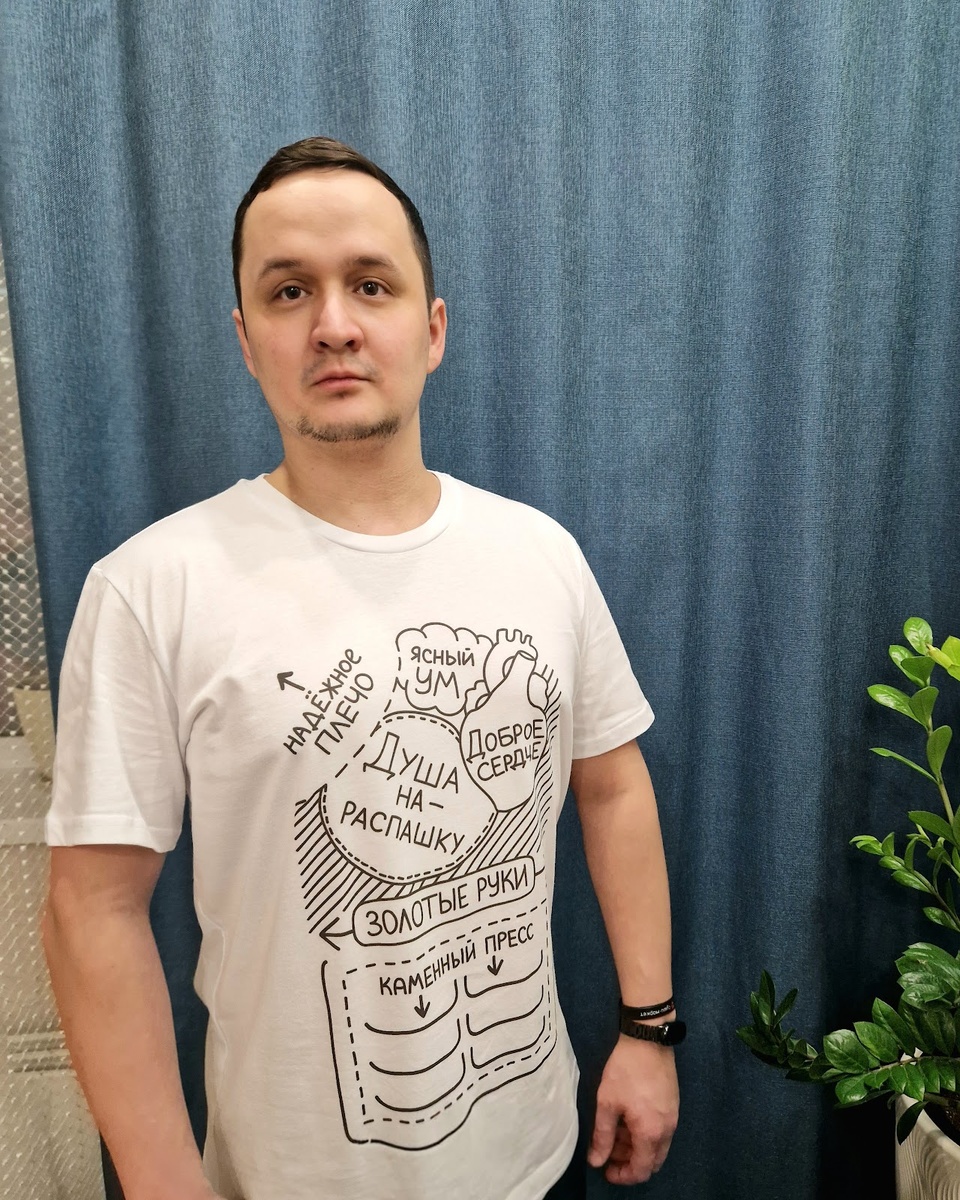 Девчонки выбрали мне футболку, оценив все мои видимые и невидимые качества. Про золотые руки польстили, конечно, в остальном я полностью согласен с надписями: