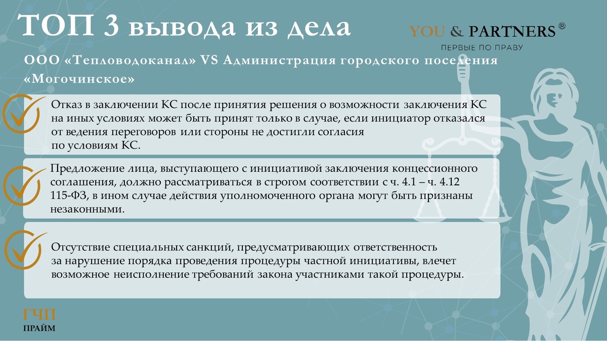 Рассмотренное дело в первую очередь обращает внимание публичной стороны на необходимость следования установленной процедуре рассмотрения предложений по 115-ФЗ. Нужно помнить, что законодательство не содержит возможностей и случаев отказа от заключения соглашения, когда в ходе ЧКИ принято решение о возможности заключения на иных условиях. Но жизнь богаче. В нашей практике публичная сторона избегает принятия такого решения, обращаясь к частной стороне за помощью, если процедуру нужно прекратить.