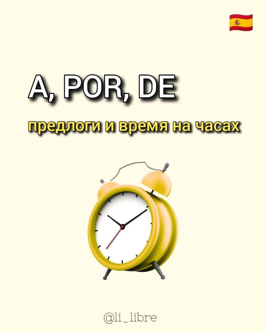 Что вы знаете о времени? О том, как поговорить о нем по-испански. Тема эта, хоть и изучается на начальных этапах знакомства с язык, однако может вызывать трудности. Всё дело в предлогах. Давайте посмотрим. Если вы хотите спросить "во сколько..." вам понадобится именно этот предлог. ¿A qué hora comienza la clase de yoga? A las 18.30. Во сколько начинается урок йоги? В 18.30. Обратите внимание, в ответе, как и в вопросе мы ставим предлог a. Это распространенная ошибка нас, русскоязычных. Мы хотим использовать здесь предлог en. Потому что именно en чаще всего переводится как "в". Но в данном случае en использовать нельзя. Давайте посмотрим на то, что в русском языке мы бы регулировали окончаниями: por la mañana (tarde, noche) - утром (днём, вечером); de la mañana (tarde, noche) - утра (дня, вечера). Пример: Mi clase de baile comienza a las 10 de la mañana. Уроки танцев начинаются в 10 утра. El sábado por la tarde voy al gimnasio. В субботу днём я пойду в зал. Ещё у меня есть телеграм с