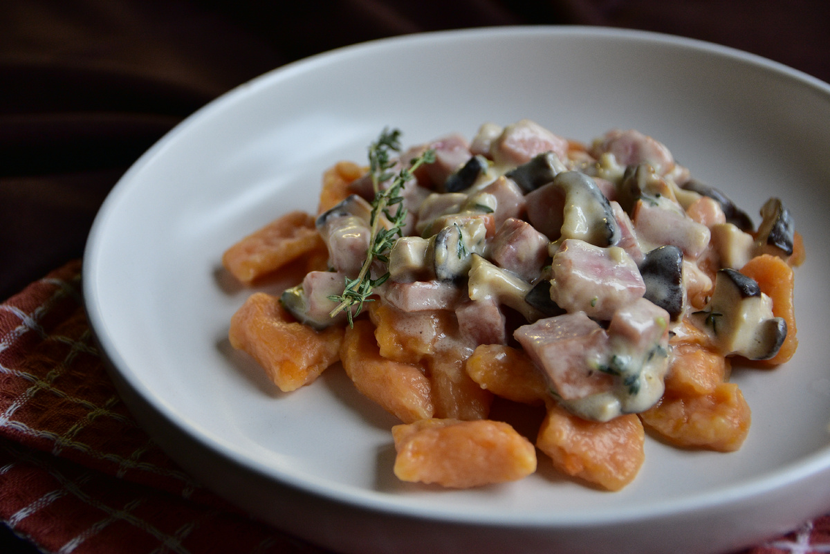 Хотите удивить близких необычным ужином? Предлагаем рецепт изысканных ньокки из батата с грибным соусом. Это блюдо сочетает в себе нежность итальянской пасты и богатый умами-вкус азиатских грибов шиитаке. Интересный факт Знаете ли вы, что ньокки – одно из древнейших блюд итальянской кухни? Традиционно их готовили из картофеля, но современная кухня экспериментирует с разными овощами. Батат делает ньокки не только вкуснее, но и полезнее: в нем содержится больше клетчатки и витамина А, чем в обычном картофеле. Ингредиенты: Для ньокки: - Батат – 1 шт. (крупный) - Мука – 4 ст.л. - Соль – по вкусу Для соуса: - Грибы шиитаке – 150 г - Ветчина – 80 г - Сливочный сыр с голубой плесенью – 100 г - Сливки 10% – 200 мл - Мука – 1 ст.л. - Свежий тимьян – несколько веточек - Соль – по вкусу Пошаговое приготовление: 1. Начинаем с батата. Заворачиваем его в фольгу и отправляем в разогретую до 180°C духовку на 45 минут. Этот способ приготовления позволяет раскрыть естественную сладость батата. 2. Посл