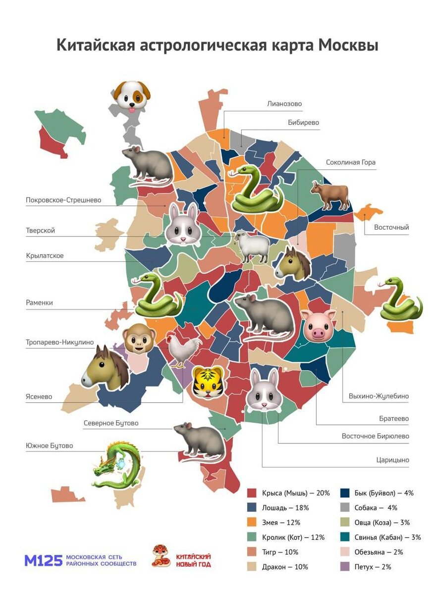 По восточному гороскопу. По случаю празднования Китайского Нового года эксперты провели опрос и выяснили, что среди москвичей больше всего крыс (по году рождения). Рожденных в год этого животного оказалось 20% среди опрошенных. Далее следует лошадь (18%), змея (12%) и кролик (12%). Самыми редкими оказались москвичи, рожденные в год свиньи (3%), обезьяны и петуха (по 2%).