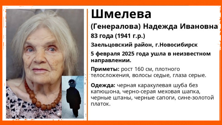 В Заельцовском районе Новосибирска без вести пропала 83-летняя Надежда Шмелева (Генералова). Как сообщили в поисково-спасательном отряде (ПСО) «ЛизаАлерт», с 5 февраля 2025 года ее местонахождение неизвестно, пенсионерка ушла в неизвестном направлении, к поискам подключились волонтеры. Приметы пропавшей: рост 160 сантиметров, плотного телосложения, волосы седые, глаза серые. В день исчезновения сибирячка была одета в черную каракулевую шубу без капюшона, черно-серую меховую шапку черные штаны, черные сапоги и сине-золотой платок. Если у вас есть информация о местонахождении Надежды Шмелевой, сообщите об этом по телефону ПСО 8-800-700-54-52 или наберите 112. Ранее «Вести Новосибирск» писали, что в областном центре завершили поиски тяжело дышащего открытым ртом 47-летнего мужчины.