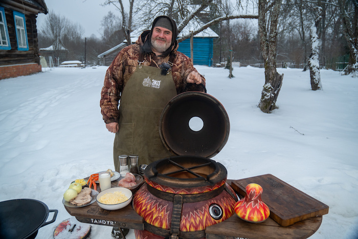 Шаг 1. Лук очистить, нарезать мелким кубиком. Шаг 2. Куриное филе и ветчину нарезать короткими брусочками. Шаг 3. Садж поставить на открытый огонь тандыра, разогреть. Положить половину масла, обжарить весь лук и снять с нагрева. Шаг 4. Затем добавить на садж масло и обжарить куриное филе. Шаг 5. Добавить лук и сливки, посолить, поперчить, перемешать. Дать сливкам загустеть, снять с нагрева. Разложить куриный жюльен по кокотницам, посыпать тёртым сыром. Шаг 6. Ветчины смешать со второй половиной жареного лука, разложить по кокотницам. Залить сливками, посыпать сыром. Шаг 7. Клешни варёного краба разрезать ножницами, вынуть мясо. Шаг 8. Крабовое мясо разобрать руками на волокна, разложить по кокотницам, залить сливками. Затем посыпать тëртым сыром. Шаг 9. Все кокотницы поместить на верхнюю полочку двухуровневой решётки-гриль, поместить решётку в тандыр, разогретый до 250°С на 5 минут, пока сыр не подрумянится. Приятного аппетита. С вами был Хаким Ганиев и мой друг ЭкоТандыр. Еще бол