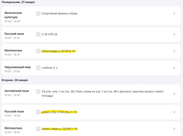 В качестве примера - задания на прошлую неделю. Я выделила цветом задания из сборников, которые мы сами покупали в начале года.