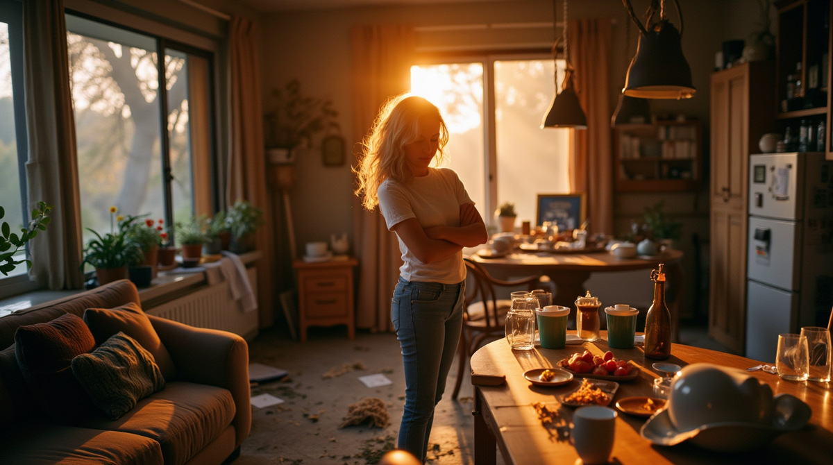 Вечером, когда все разошлись, она стояла посреди гостиной, оглушённая внезапной тишиной. Везде следы веселья: грязная посуда, крошки, смятые салфетки на полу... А ей ещё стирать скатерть и оттирать пятна с ковра.