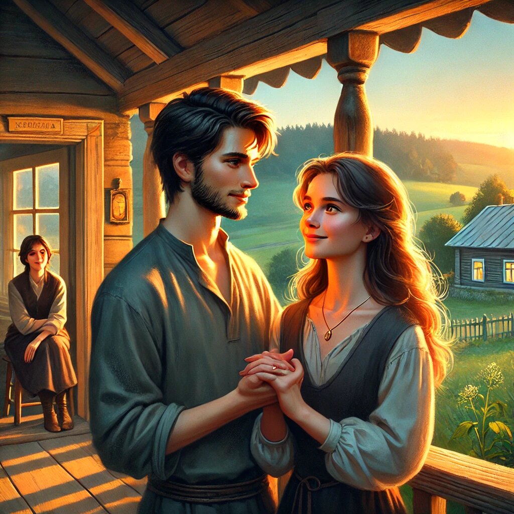 Деревня была тихой, с деревянными домами, каждый при своём палисаднике. В воздухе пахло дымом из печных труб, а откуда-то доносился лай собаки. Они зашли во двор к небольшому, но уютному дому, где на крыльце сидел пожилой мужчина, нахмуренный от тревог.