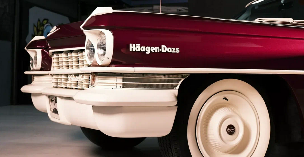 West Coast Customs выбрали для проекта классический Cadillac Series 62 – культовый кабриолет, который идеально подходит для придания ретро-элегантности. Автомобиль окрашен в фирменные цвета Häagen-Dazs – глубокий бордовый с кремовыми вставками. Хромированные элементы заменили на матово-кремовые, что делает внешний вид еще более стильным и современным.